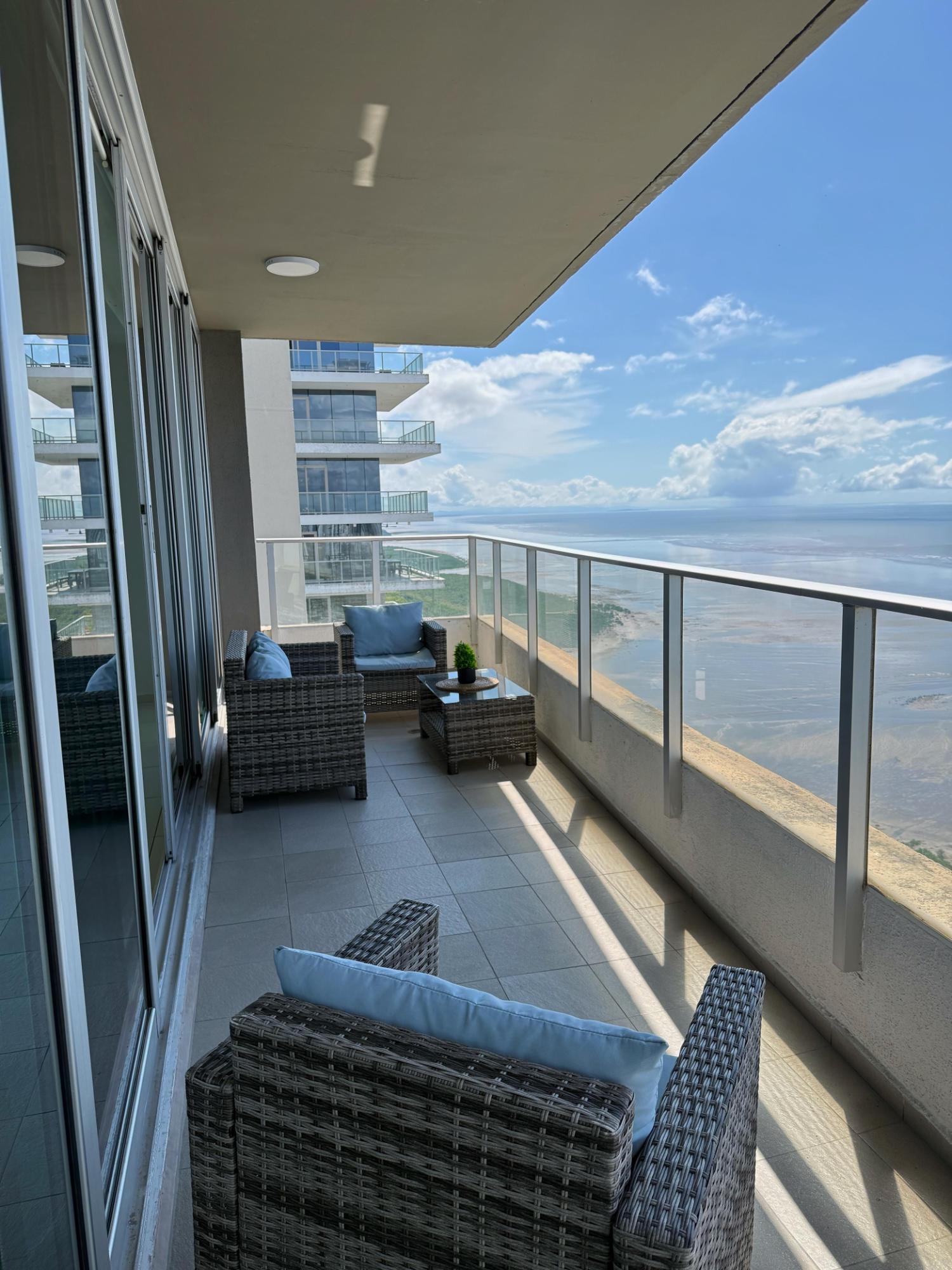 Ubicado en una de las zonas más exclusivas de la Ciudad de Panamá, con vista directa al mar, excelente diseño y distribución. Apartamento de 299 m2 con: • Recámara principal tipo suite con walk incloset, estar interior y jacuzzi, con vista al mar; • Dos recámaras secundarias amplias, cada una con baño privado y walk in closet; • Baño social; • Amplio den; • Estudio; • Balcón; • Sala; • Comedor; • Cocina con isla y desayunador; • Lavandería con tendedero; • Recámara y baño de servicio. • 2 estacionamientos dobles