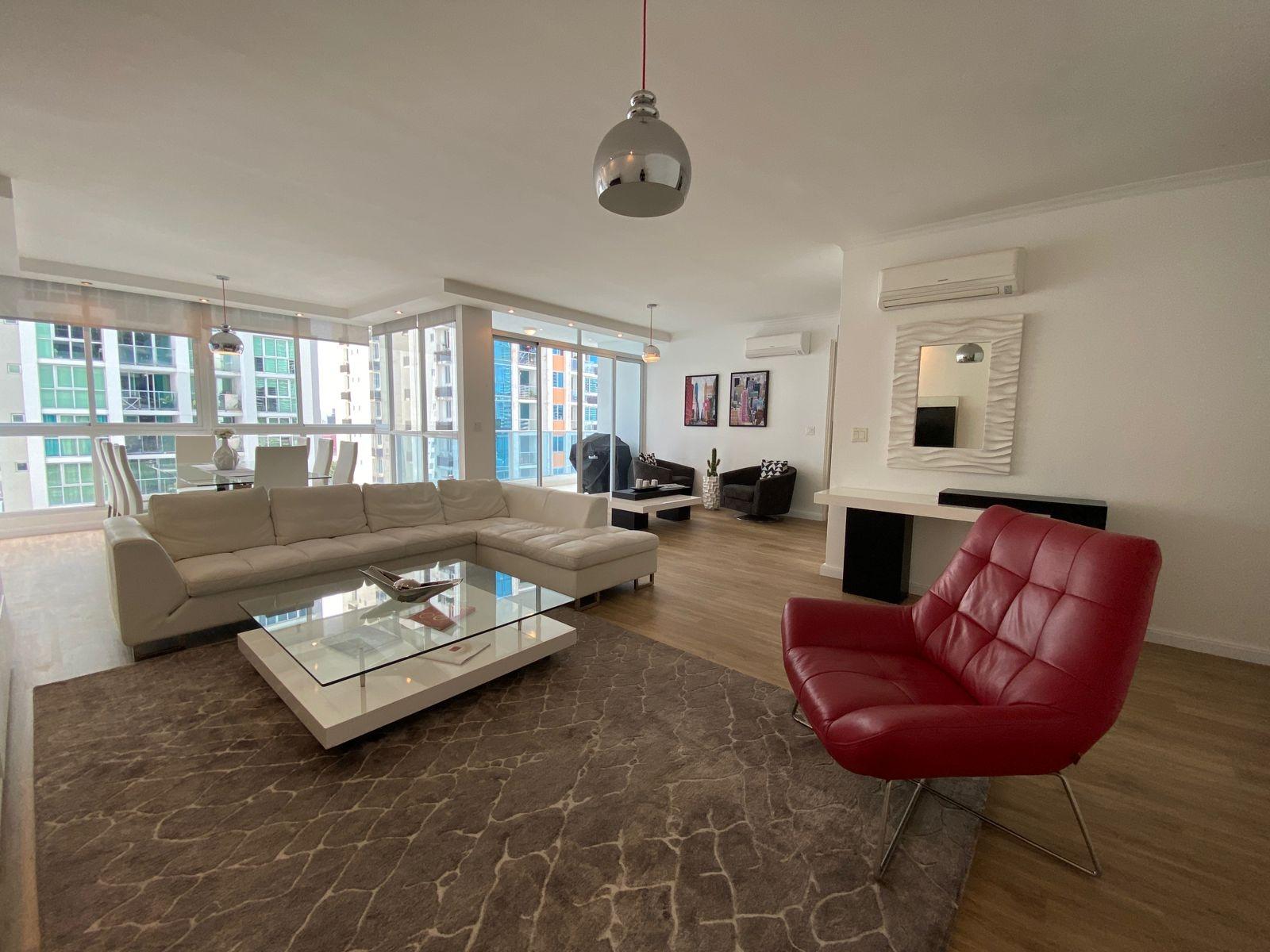 Apartamento de 3 recámaras y 2.5 baños en la calle 43 Bella Vista a pocos pasos de la Avenida Balboa y el Parque Urracá, con cocina remodelada y muebles modernos. El apartamento cuenta con 2 balcones, uno en sala-comedor y otro en recámara principal. Amplia sala-comedor, cocina con área para desayunador, closets para blancos, amplia lavandería y cuarto y baño de servicio. La calle cuenta con supermercado y farmacia y a un poco más de una cuadra se encuentra la cinta costera, donde se puede relajar, caminar o realizar varios deportes.