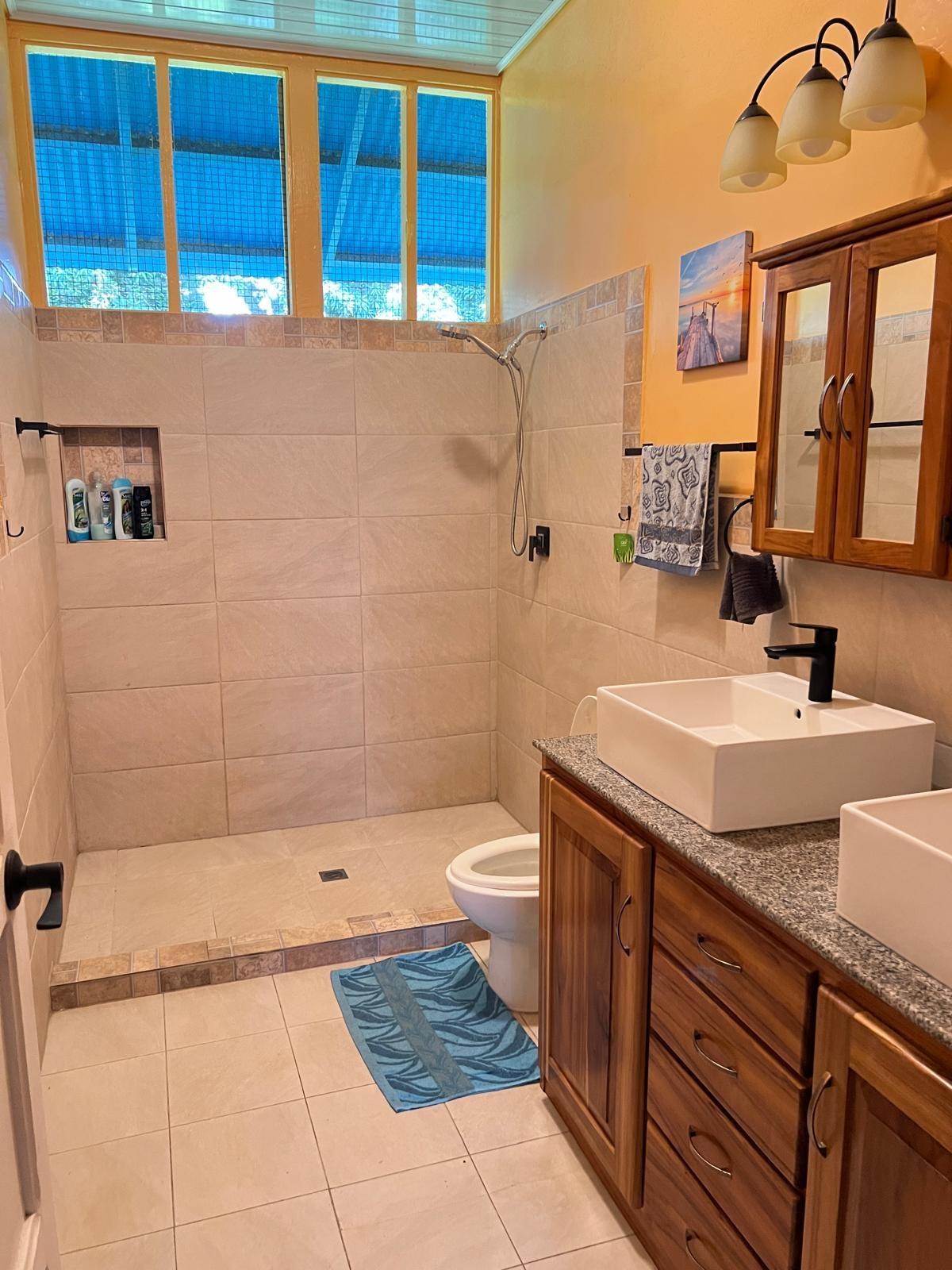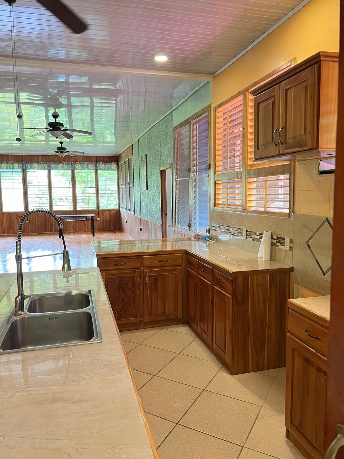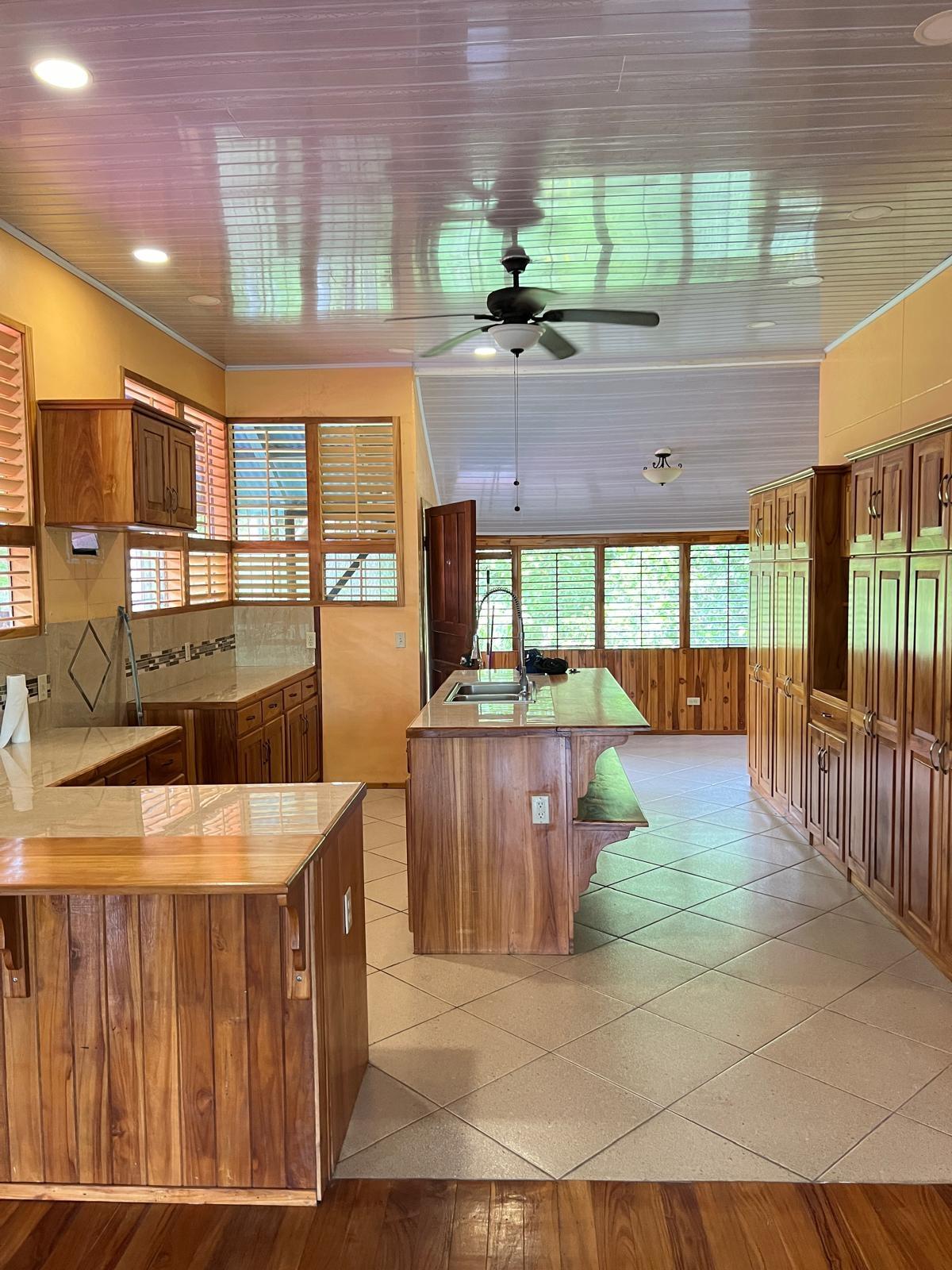 Casa clásica de plantación bellamente restaurada en Puerto Armuelles. Minuciosamente actualizada con estándares modernos, conservando la elegancia y el encanto de la construcción original de postes y vigas de la década de 1940. La planta principal de 198 metros cuadrados cuenta con tres dormitorios y dos baños completos, y en la planta baja hay un apartamento totalmente equipado de un dormitorio y un baño. La amplia cocina cuenta con una isla central, barra de desayuno, pisos de baldosas y amplios gabinetes de almacenamiento de teca nativa. Las áreas de estar superiores de la casa están adornadas con hermosos pisos de madera noble nuevos. La casa está diseñada para aprovechar la brisa del Pacífico; incluso se puede escuchar el susurro de las olas. Las ventanas cubren la mayor parte de las paredes exteriores, con ventiladores de techo en cada habitación. Los tres dormitorios son espaciosos y los techos de 2.7 metros en toda la casa, lo que brinda una sensación aún más abierta. La casa se entrega parcialmente amueblada. La planta baja cuenta con un dormitorio, un baño y un cuarto de invitados con aire acondicionado, un amplio lavadero interior y nuevos armarios de teca. El apartamento se alquila por $500 al mes, por lo que puede utilizarse para generar ingresos o como alojamiento para invitados. Se entrega parcialmente amueblado. Dispone de servicios modernos como teléfono, televisión por satélite y conexión DSL. Un tanque de reserva de agua con sistema de bomba presurizada garantiza un suministro constante de agua. La propiedad cuenta con jardines y un portón eléctrico automático en la entrada.