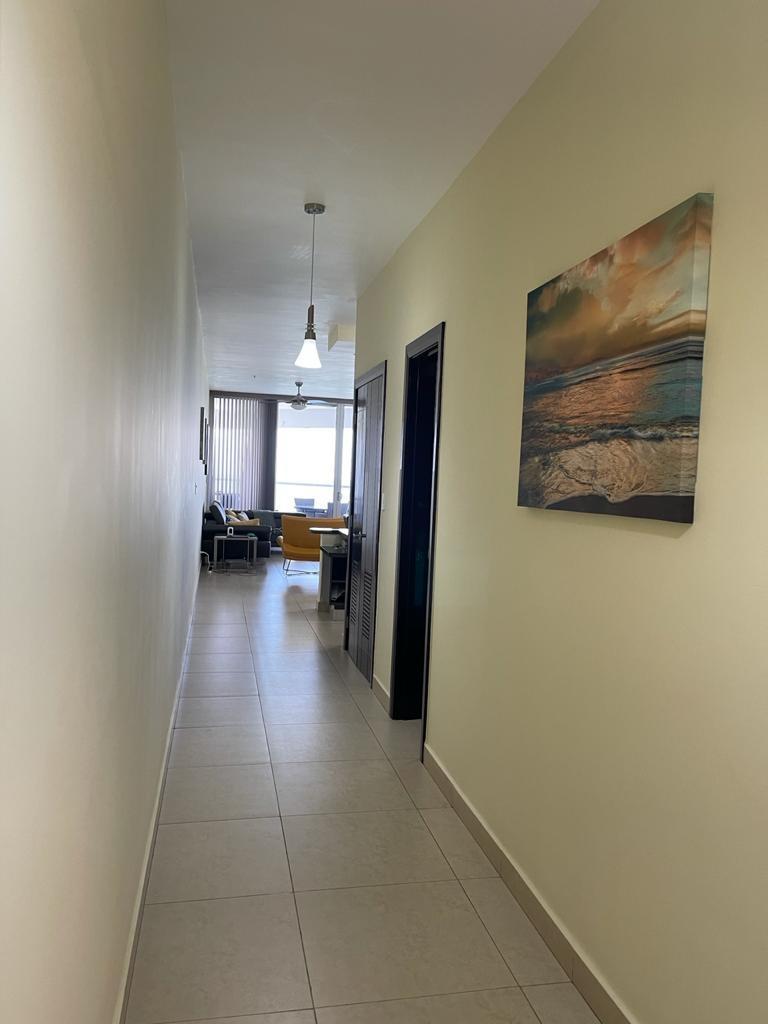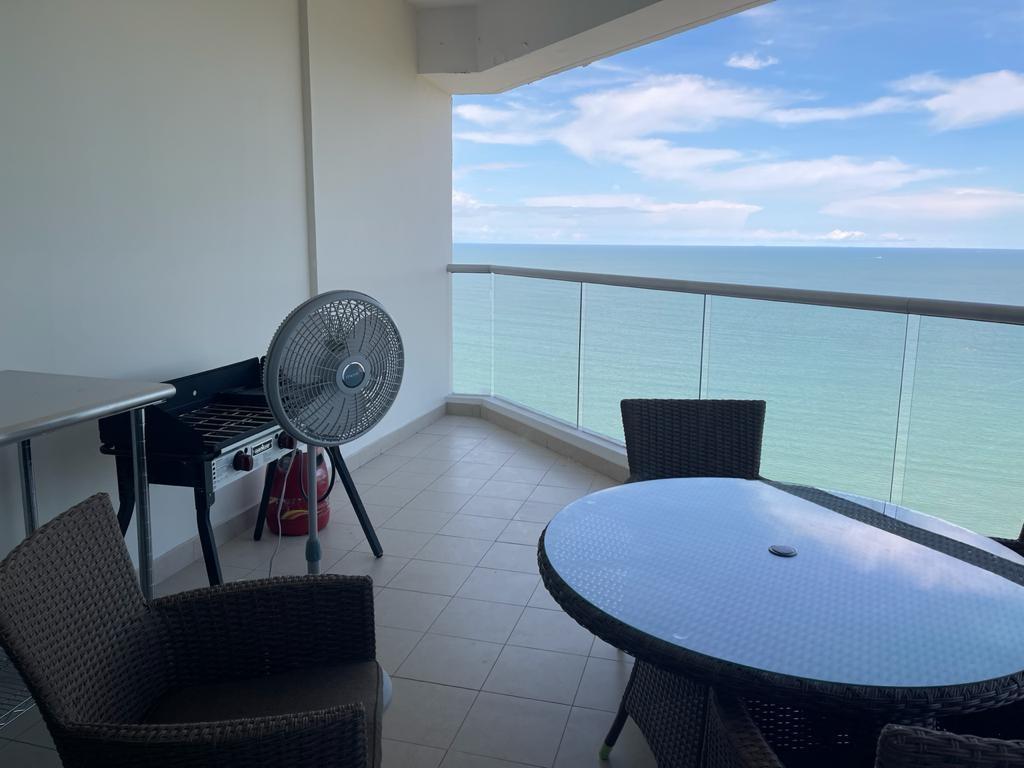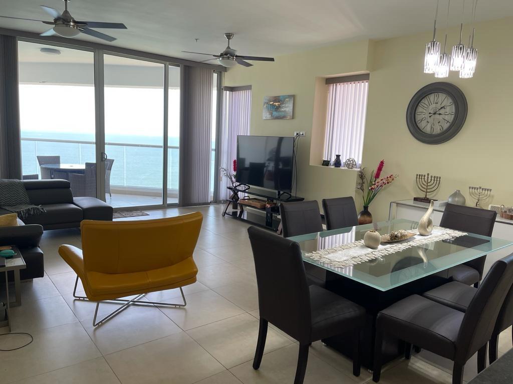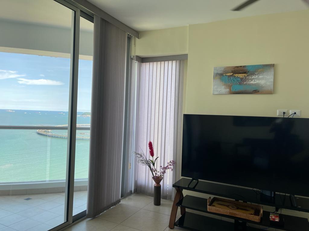 Se alquila hermoso apartamento en PH Rivage, ubicado en un piso alto con impresionante vista directa al mar. Esta elegante unidad de 141 m² cuenta con 1 recámara amplia, 1.5 baños, sala y comedor independientes, cocina funcional con acabados modernos, y un balcón grande ideal para disfrutar del aire libre y los atardeceres sobre el océano. La recámara principal es luminosa y cómoda, y el baño principal ofrece doble lavamanos y ducha con ventanales panorámicos que aportan amplitud y luz natural. El edificio ofrece exclusivas amenidades como piscina infinity, jacuzzi, gimnasio, sauna y seguridad 24/7. Ubicado en la prestigiosa Avenida Balboa, con fácil acceso a comercios, restaurantes y la Cinta Costera. Precio de alquiler: $1,900 mensuales, incluye línea blanca. Ideal para quienes buscan confort, elegancia y una vista inigualable al mar. ¡Disponible ya para mudarse!